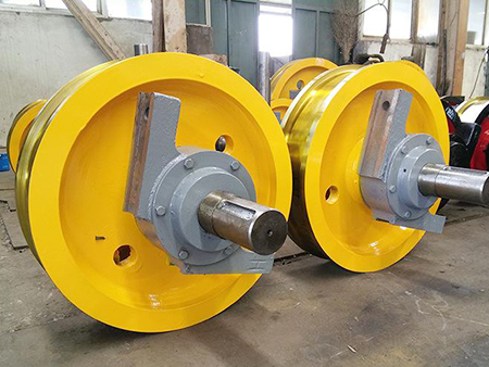 车轮是用来支承起重机和载荷,并在轨道上使起重机往复行驶运行的装置。车轮主要损伤的形式是磨损、硬化层压碎和点蚀。车轮的材料一般采用ZG430-640铸钢。为了提高车轮表面的耐磨强度和寿命,踏面应进行表面热处理,要求表面硬度为HB300-350,淬火深度不少于20mm。